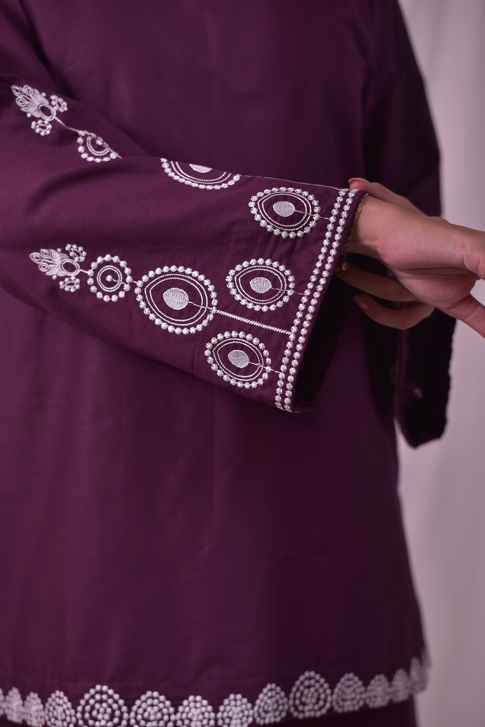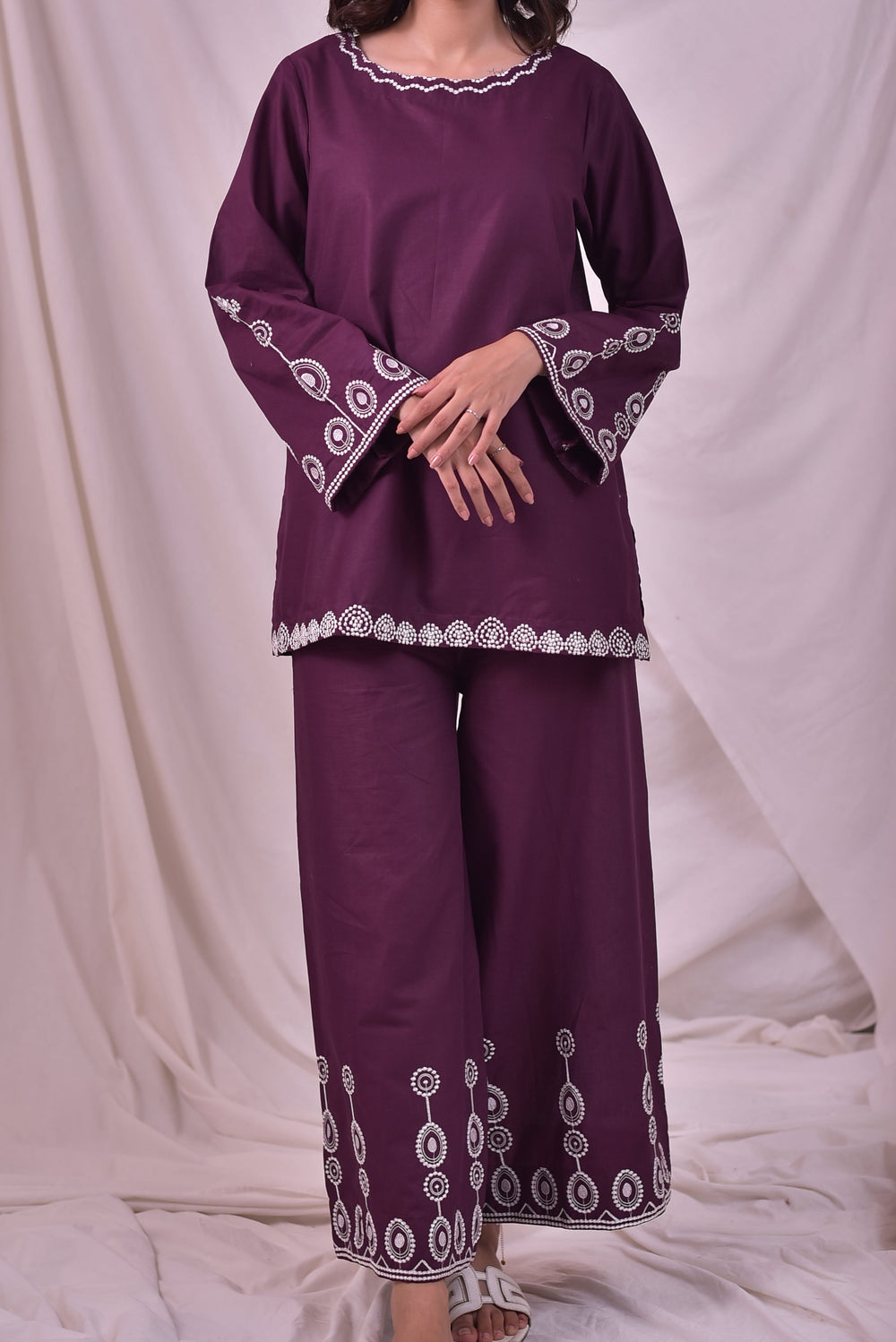 A two-piece suit crafted from premium soft cotton cambric, designed for effortless elegance.