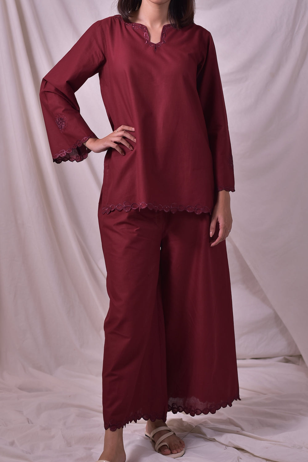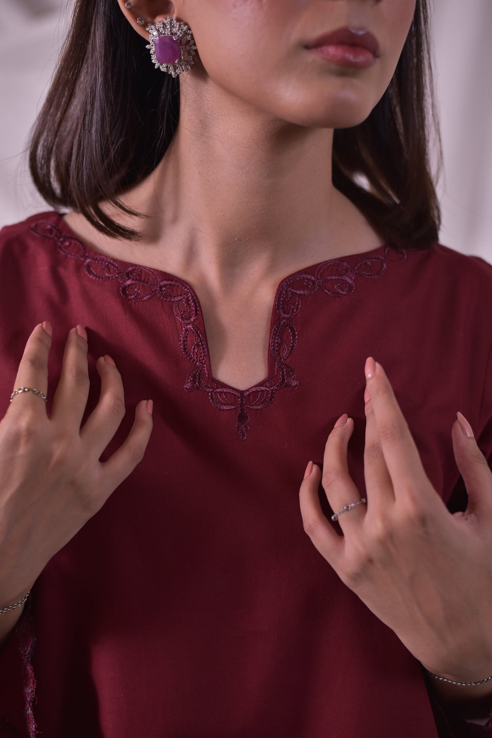 Elegantly tailored shirt featuring a delicately embroidered neckline and full sleeves for a graceful, polished look.
